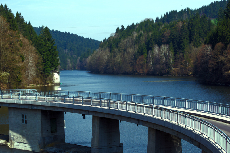 Am Ende des Weges zeigte sich, zuerst noch versteckt hinter Fichten, dann immer höher und mächtiger, die Mauer der Talsperre des Kraftwerk-Ranna. Der Pfad führte steil hinauf bis das Ende der Staumauer erreicht war. Der Blick auf den langgezogenen See und ein Rastplatz in der Sonne wurden gleich für eine ausgiebige Pause genutzt.