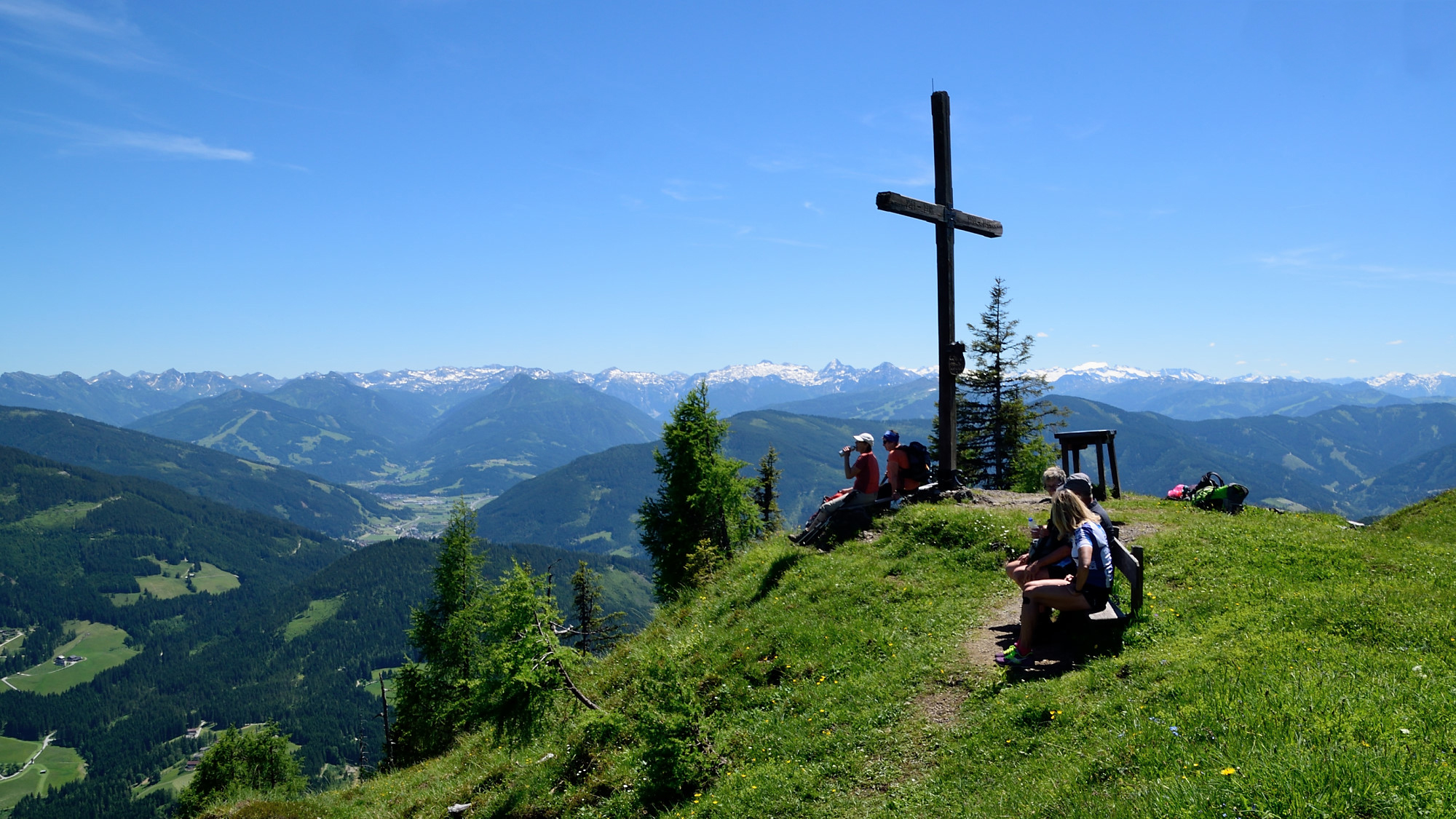 Nach insgesamt 4 Stunden standen die Pockinger auf dem 1883m hohen Frommerkogel, den höchsten Punkt ihrer Wanderung. Jetzt gab es die wohlverdiente Gipfelbrotzeit begleitet von einem sagenhaften 360° Panorama. Im Westen erhob sich der Hochkönig. Im Norden beeindruckte der mächtige Gebirgsstock des Tennengebirges. Die felsigen Hängen, darüber der tiefblaue Himmel und im Vordergrund das Grün der Bergwälder und Wiesen boten einen bilderbuchmäßigen Kontrast. Weiter hinten folgte die Osterhorngruppe. Im Osten dann der Gosaukamm mit der markanten Bischofsmütze und der 3000m hohe vergletscherte Hohe Dachstein. Im Süden reichte der Blick von den Radstätter Tauern bis zu den weißen Gipfeln der 3000der der Hohen Tauern.