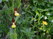 Nun folgte der schönste Teil der Tour. Über den langgezogenen Höhenzug ging es in östliche Richtung hinüber zur Koreinhöhe und weiter zur Ostermaisspitze, immer den Gosaukamm und den Dachstein im Blickfeld. Der Steig führte über blühende freie Grasflächen, durch Latschenfelder und vorbei an knorrigen, von den Jahreszeiten gezeichneten Lärchen. Angekommen auf der Ostermaisspitze dann Tiefblicke hinunter nach St. Martin. Der Pfad führte nun steil bergab in einen Latschengürtel und wieder gemäßigter durch den Wald. Hier dann das botanische High-Light des Tages. Im lichten Wald erblickten die DAVler zuerst nur eine kleine Gruppe blühender Frauenschuhe, eine streng geschützte wilde Orchideenart. Bei genauerem Hinschauen war ein ganzer „Schuhladen“ zu sehen. Dieser wurden natürlich fotografisch festgehalten. Kurz vor ende der Tour gab es noch Stärkung in der Buttermilchalm bevor es vorbei an blühenden Wiesen und Hängen mit Wollgras zurück zum Ausgangspunkt ging.