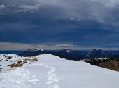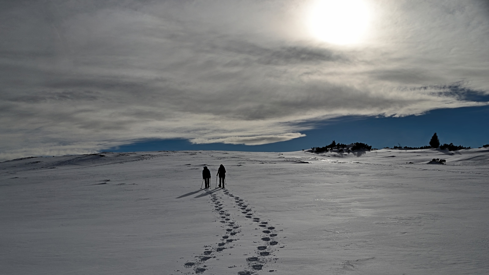 Der Aufstieg führte zuerst entlang der Langlaufloipe, die auf den ausgedehnten Almwiesen der Hämmersuppenalm seine Bahnen zieht. Erst am Waldrand trennten sich Langläufer und Schneeschuhgeher. Nun wurde das Gelände steiler und unzählige Spuren im Schnee gaben die Richtung vor. Auf einer Lichtung oberhalb der Hämmersuppenalm wurde das erste mal Rast gemacht. Beim Blick Richtung Norden zeigten sich Hochgern, Hochfelln und die Felsabbrüche Hörndlwand. Dunkle bedrohliche Wolken die erst am nördlichen Horizont vor einem hellen Himmel endeten, schufen eine außergewöhnliche Lichtstimmung. Nach ein paar Schluck warmen Tee macht sich die Gruppe wieder auf den Weg. Erst kurz vor dem Straubinger Haus kam immer mehr der Blaue Himmel durch. Nur noch ein kurzer Anstieg und der Blick nach Süden wurde frei. Jetzt zeigte sich das Kaisergebirge in seiner ganzen Größe. Ein wahrlich kaiserlicher Anblick.